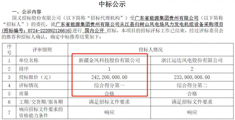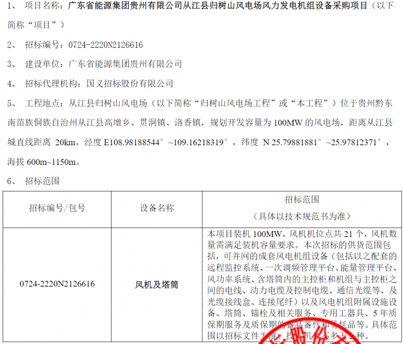 广东省能源集团贵州有限公司从江县归树山风电场风力发电机组设备采购项目中标候选人公示