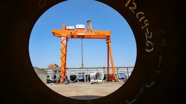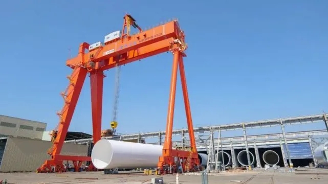 顺着广东粤水电新能源装备有限公司有关负责人手指的方向看去,一台高40米的通用门式起重机矗立在厂区,格外显眼。