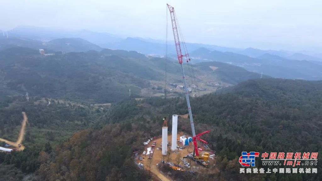 由于山地风电塔筒运输困难,加上天气条件较差,整整拖了10天才开始吊装第一、二节塔筒,吊载总重量分别为72.6t、81.6t。其实吊装当天风速并不理想,左侧达到5级,后方达到了6级,但大家都知道不能再等下去了。