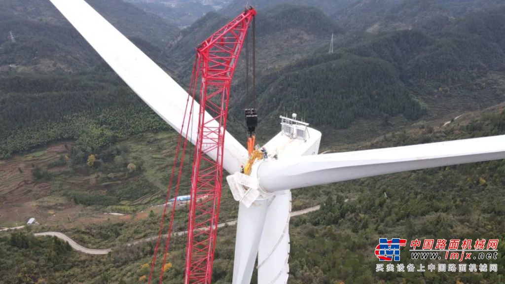 天气、风速适宜,随着地面指挥一声令下,SAC24000T立即起钩响应,仅耗时23分钟就将轮毂、叶片稳稳吊至121.8m高空。到达位置后再回转、起幅、落钩,与传动链进行对接,这个工位的吊装任务圆满完成。