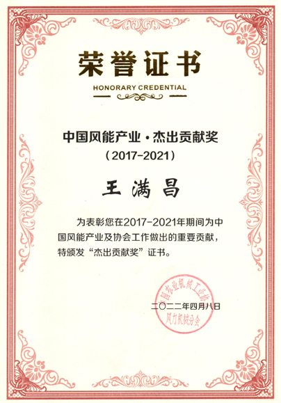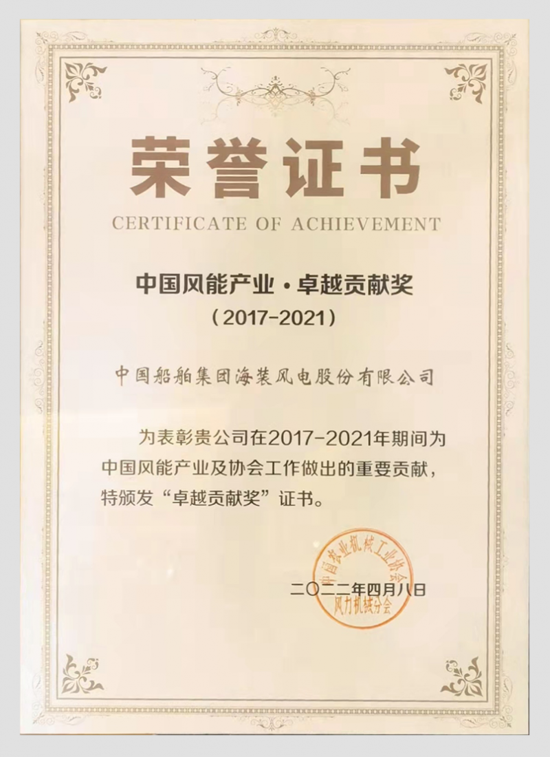 4月8日,在中国农业机械工业协会风力机械分会第八届会员大会上,中国海装2017-2021年期间为中国风能产业做出的重要贡献,荣获“中国风能产业·卓越贡献奖”。