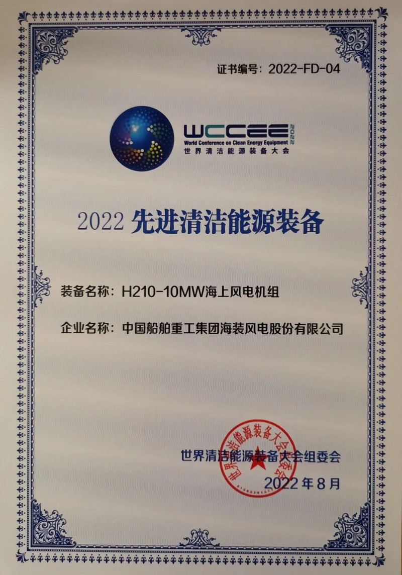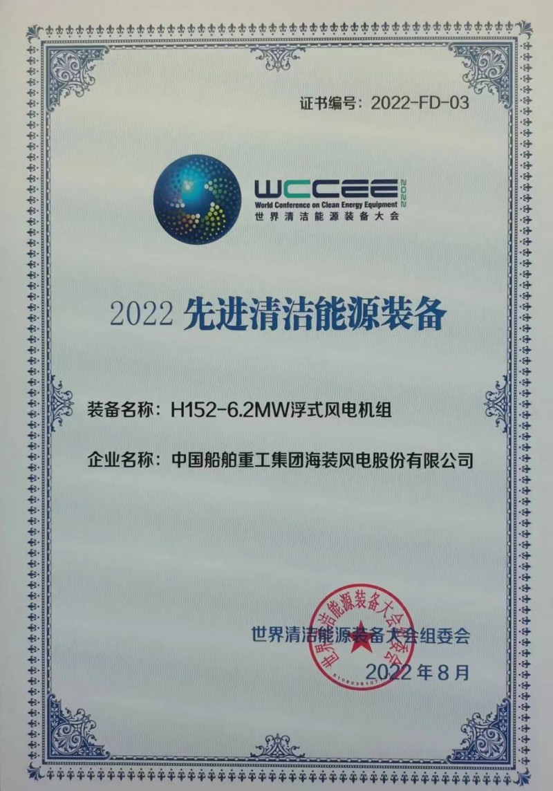 8月27日,在2022世界清洁能源装备大会上,中国海装H210-10MW海上风电机组、H152-6.2MW浮式风电机组“2022先进清洁能源装备”荣誉。