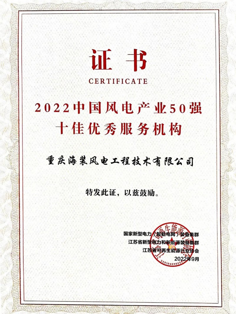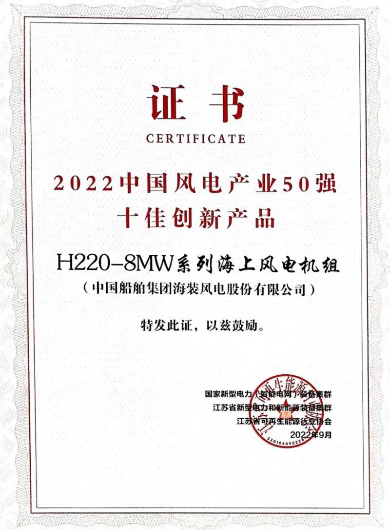 9月20日,中国海装H220-8MW系列海上风电机组获2022中国风电产业50强 “十佳创新产品”荣誉,中国海装工程技术公司获“十佳优秀服务机构”荣誉。