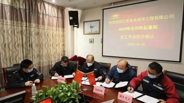 2022年12月30日,由振华重工为江苏龙圣海工建造的4000吨全回转起重船“秦航工5000”,在启东海工顺利举行完工交付的四方见证仪式。江苏龙圣海工、中国船级社、南通海事局、振华重工相关代表共同出席,并签署了四方见证的相关文件。