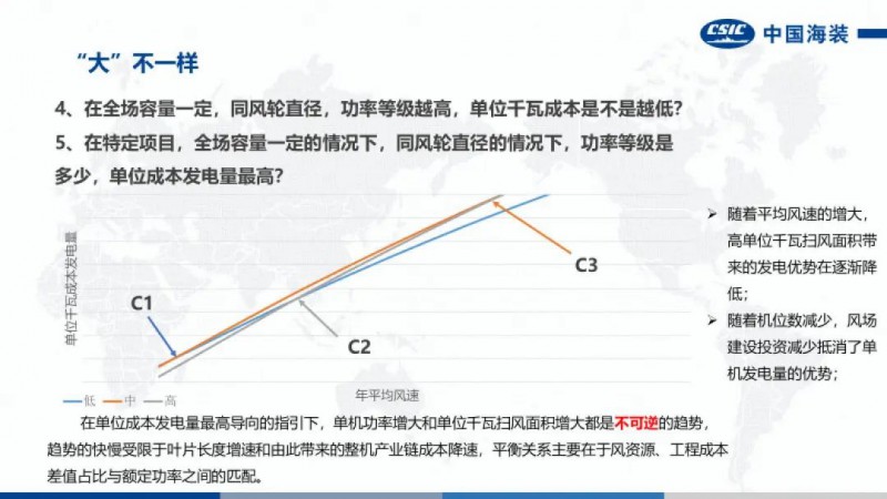 早在2018年第三届全球海上风电领袖峰会上,海装即提出“单机功率增大和单位千瓦扫风面积增大都是不可逆的趋势”,并指出了影响趋势发展快慢的因素。近两年风电产品的快速迭代,也验证了这一观点。