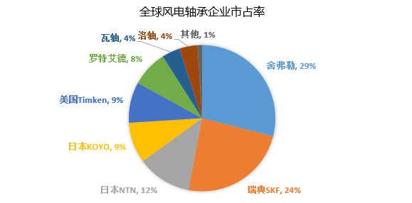 目前大部分零部件都实现了国产化,比如叶片、齿轮箱、主轴等等。但是主轴轴承的国产化率还比较低,毛利率超过40%,是技术壁垒最高,最难突破的环节。主轴轴承主要是用来支撑风机主轴的,是非常关键的零部件,且随着风机大型化趋势,直径越大,主轴轴承的工艺难度就越大,目前高端市场依然被瑞典、德国、日本、美国垄断。