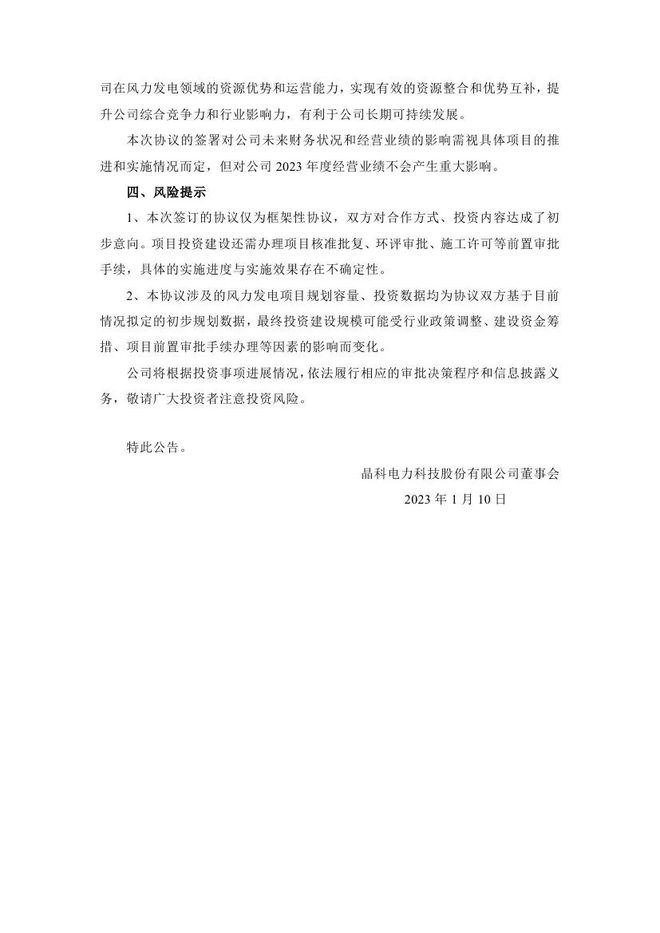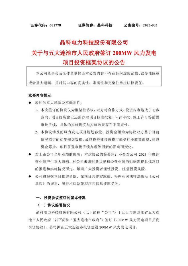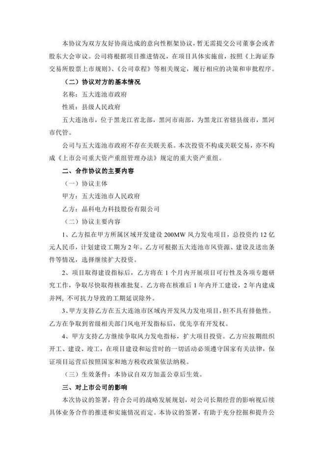 1月10日,晶科电力科技股份有限公司发布关于与五大连池市人民政府签订200MW风力发电项目投资框架协议的公告,公告称晶科科技于近日与黑龙江省五大连池市人民政府签订《200MW 风力发电项目招商引资协议》,公司拟在五大连池市投资建设200MW风力发电项目。