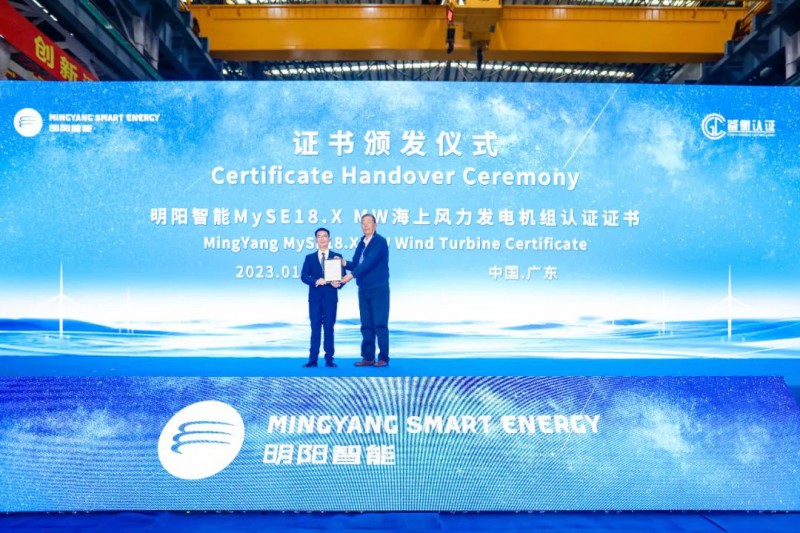 1月10日,鉴衡认证向明阳智能MySE18.X-28X海上风力发电机组颁发设计评估符合证明。这是目前通过认证的全球最大海上风力发电机组,将助力提升风机效率、降低海上风电机组成本,推动海上风电平价上网。