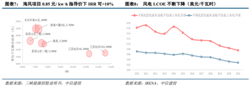 2、国补退出后,海风降本开始提速,2020年国内海风造价约为17元/瓦, 2022年上半年已下降至12元/瓦左右,风机和工程成本下降是主因,2021年全球加权平均海风发电成本为0.52元/度,接近煤电上网电价;