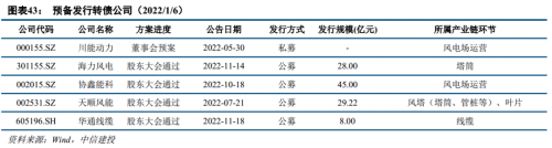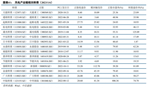 风电产业链可以分为上、中、下游三部分,上游是原材料以及零部件如发电机、风塔、叶片和主轴等的供应商,中游则包括整机、线缆等的制造商和工程建筑企业,下游是风电场运营商。主要存续转债发行企业包括上游主营风塔制造的天能重工、从事主轴和轴承生产的通裕重工和新强联、干式变压器龙头金盘科技、铸件以及齿轮箱零部件生产商广大特材和从事锻件生产的中环海陆,中游电缆光缆制造商起帆电缆、杭电股份、通光线缆、中辰股份、日丰股份和永鼎股份等,下游风电场运营商福能股份、嘉泽新能和节能风电。潜在标的还包括孚日股份、精达股份、闻泰科技、宏发股份、韦尔股份、捷捷微电、山东玻纤和长海股份等。
