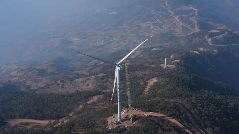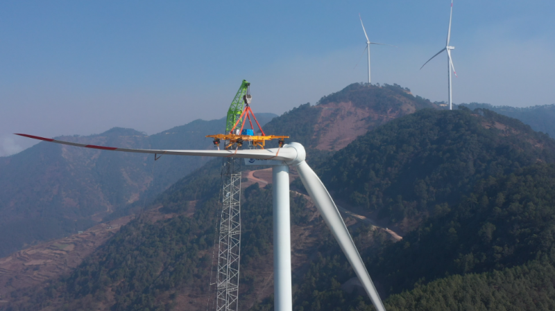 腊巴山风电场地处高海拔山地,地形陡峭,森林植被覆盖率高,吊装施工高峰期又正值大风季节。项目采用的风电机组叶轮直径达到172米,扫风面积超过23000平方米,相当于3.2个标准足球场的面积。