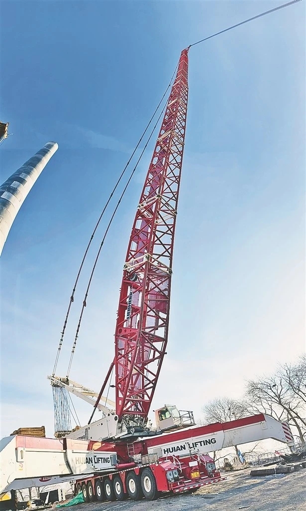每台风机主要由塔筒、主机和叶片组成,吊装高度将达到110余米,需要十余天时间才能完成整个吊装。该项目共8台风机,每台风机单机容量均为6.25兆瓦,机舱中心高度150米,其中吊装最重单件是140吨的机舱,叶片长度为92米。