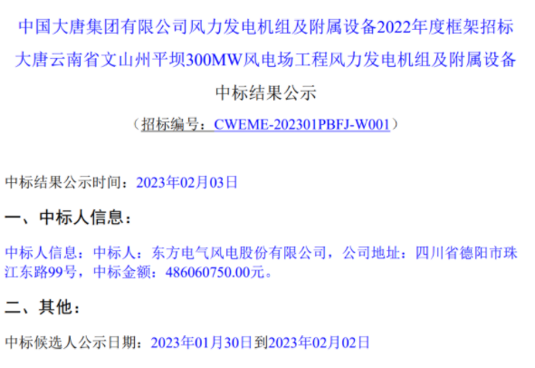公告显示,东方电气风电股份有限公司成功中标该项目,中标价格为486060750.00元。