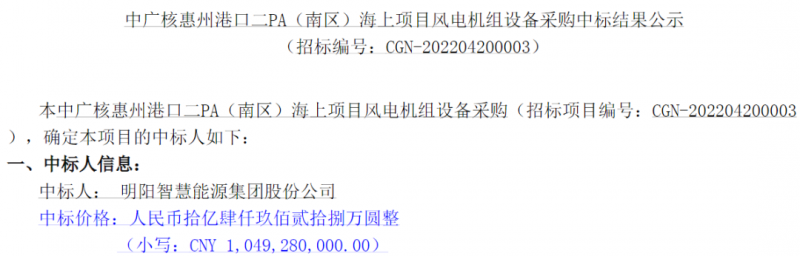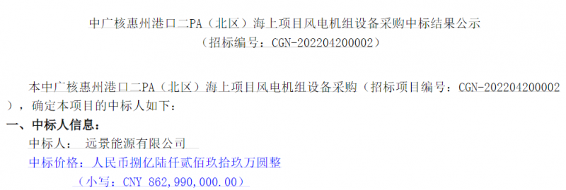1、中广核惠州港口二PA(北区)海上项目风电机组设备采购中标结果公示