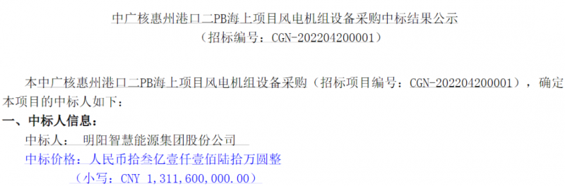 32亿元!中广核惠州海上风电项目中标结果出炉!这两家整机商中标!
