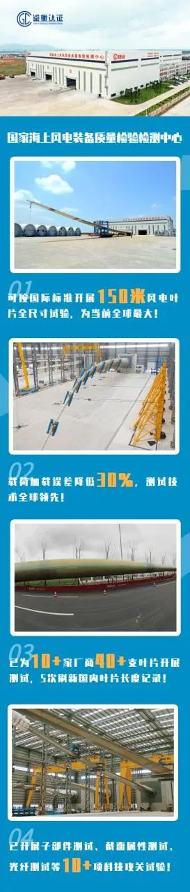 国家海上风电装备质量检验检测中心由国家认监委批准,鉴衡认证中心建设运营,于2021年正式投运。国家质检中心建有整机实验室、全尺寸叶片实验室、在役机组检验实验室、化学实验室,在海上风电装备领域形成了从原材料、部件、整机到在役机组的全生命周期检验、检测服务能力。其中,国家质检中心叶片实验室可按国际标准开展150米叶片全尺寸试验,为当前全球最大。2021年投运以来,已经开展40多支叶片的研发测试工作,其中百米级叶片5支,正在测试的叶片长度超过120米,极大拓展了我国大型海上风电整机及部件的测试资源。