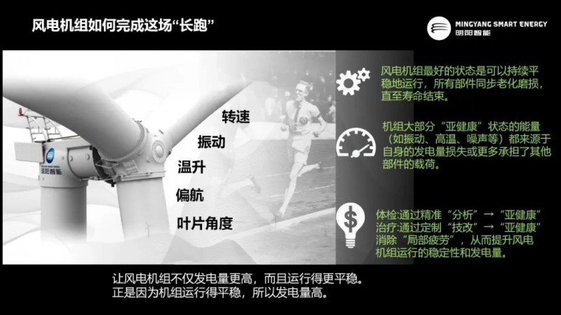 对此,润阳能源副总经理刘昊表示:优秀的风电机组不仅要运行得更稳定,而且要比其他风电机组生命周期更长。刘昊指出,对于在役的风电机组,发电量主要取决于机组的可靠性以及机组自身的发电性能。针对机组的可靠性,为了更好的提升机组的可利用率及发电量,需要机组保持平稳的运行状态。而机组大部分“亚健康”状态的能量(如振动、高温、噪声等)都来源于自身的发电量损失或更多承担了其他部件的载荷。