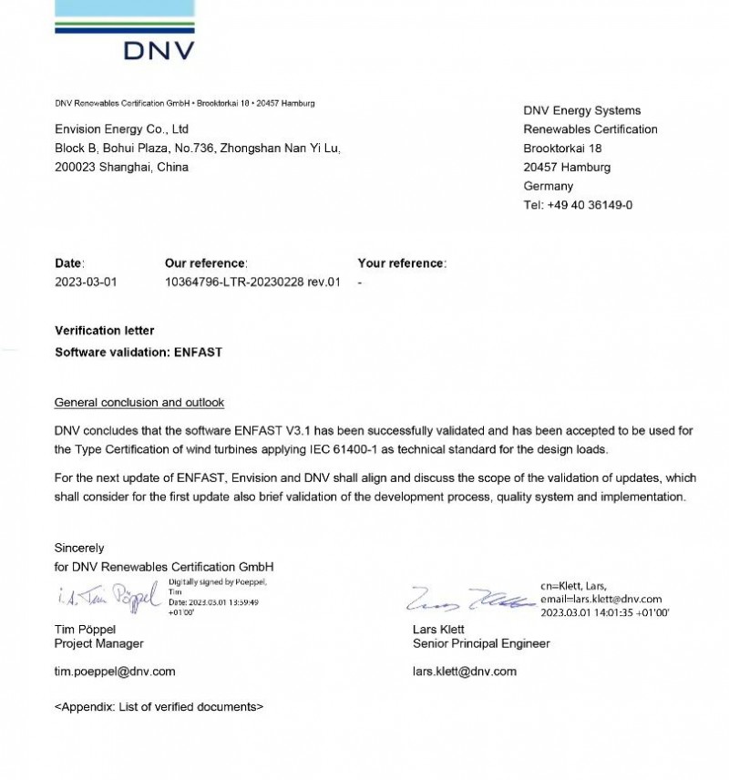 此次获得DNV的国际权威认证,也意味着远景能源打通了面向国内外市场风电设计软件的一致性,提高了认证效率。目前,ENFAST已承担了远景能源包含EN200、EN252等自研叶片、海陆风机产品平台和风电场解决方案的设计工作。在可以预见的未来里,以远景能源为代表的中国风机在国际市场上将更具竞争力。