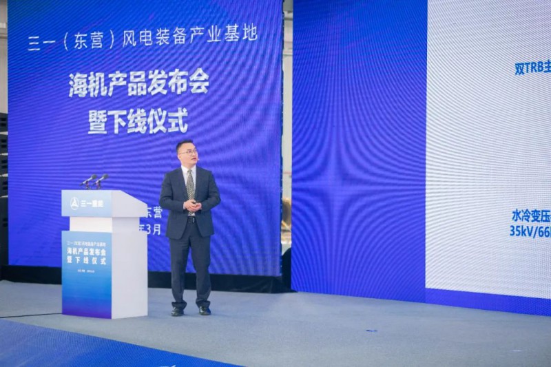 3月31日,三一重能在三一(东营)风电装备产业基地隆重举行海机产品发布会暨下线仪式。东营市副市长孙永,东营经济技术开发区党工委书记、管委会主任康茂礼,三一重能副总经理余梁为,三一重能副总经理、首席数字官彭旭,三一重能研究院副院长陈为国,三一重能海上风电总经理张飞龙,东营市政府、开发区、中国质量认证中心相关部门负责人及三一重能客户代表出席并见证了这一重要时刻。仪式由三一重能副总经理、首席数字官彭旭主持。本次下线的海上机组产品是三一重能在东营下线的首款产品,标志着三一重能正式进军海上风电市场。