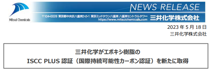 三井化学环氧树脂取得ISCC PLUS认证