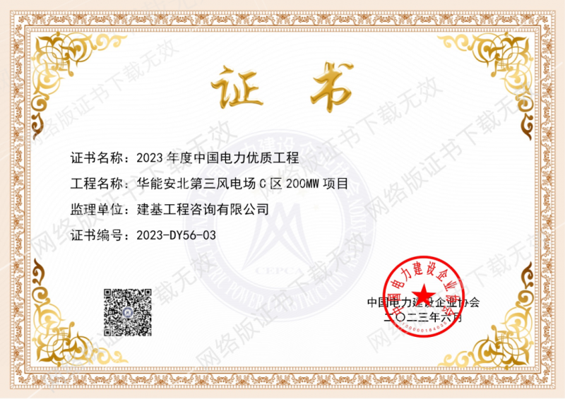 近日,中国电力建设企业协会印发《关于对2023年度中国电力优质工程评审结果进行公示的通知》,公司监理的华能安北第三风电场C区200MW 项目荣获“中国电力优质工程”奖。