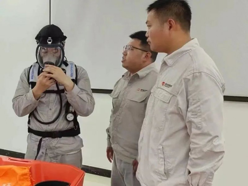 此次培训的主要内容是正压式呼吸器检查维护和正确使用。检查呼吸器的报警性能,面罩密封是否良好,吸气阀是否完好,供给阀动作是否灵活,气瓶压力是否正常。演示气瓶的穿卸,面罩的佩戴,讲解了使用要领和维护方法。确保每位员工对正压式呼吸器的做到懂原理,会使用,知管理。