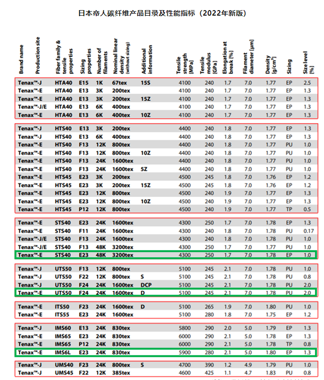 日本帝人集团(包括帝人有限公司、帝人欧洲以及帝人美国公司)2022版Tenax?碳纤维的最新产品目录和性能指标,与此前2020版产品目录相比,主要变化在于新增了三款碳纤维,其中包括一款48K规格大丝束碳纤维。