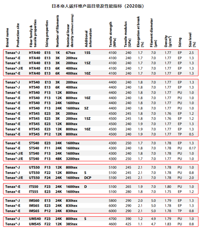 帝人碳纤维产品最新性能指标