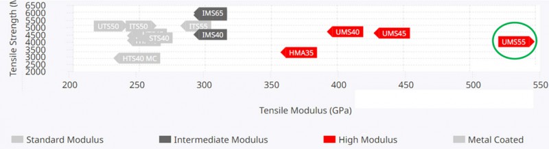 高模量碳纤维:新版产品中依旧不再提供UMS 55(540GPa),从而使得帝人公司商品化碳纤维最高模量仅为UMS 45的425GPa,但在产品宣传页面中仍然保留UMS55型碳纤维信息(如下图所示)。