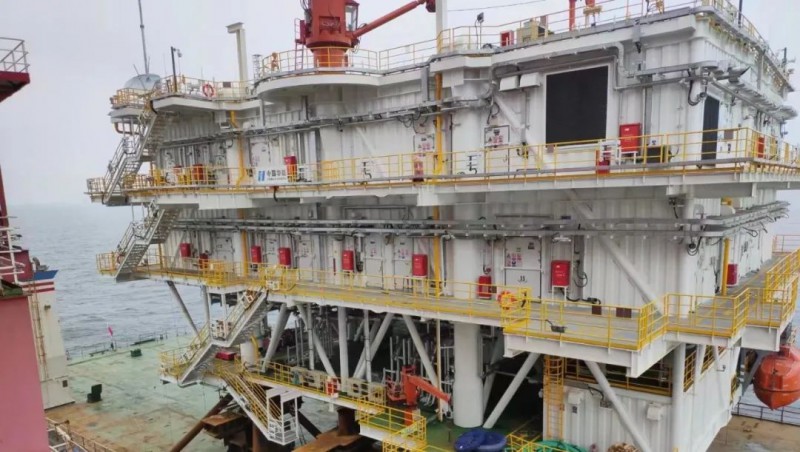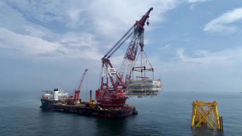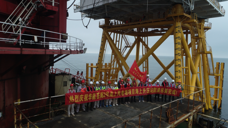 6月7日下午3时20分,升压站上部组块吊装就位结束,标志苍南2号海上风电项目海上升压站安装任务圆满完成。
