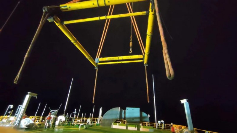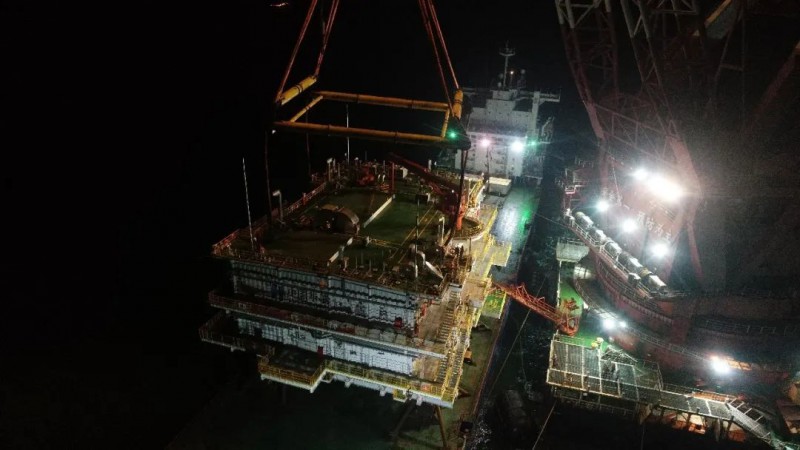 6月6日于早上7点上部组块运输船(华拓)靠泊华西5000,开始上部组块挂索、解绑作业,于6月7日12:30顺利起吊,绞锚至已安装好的导管架旁。