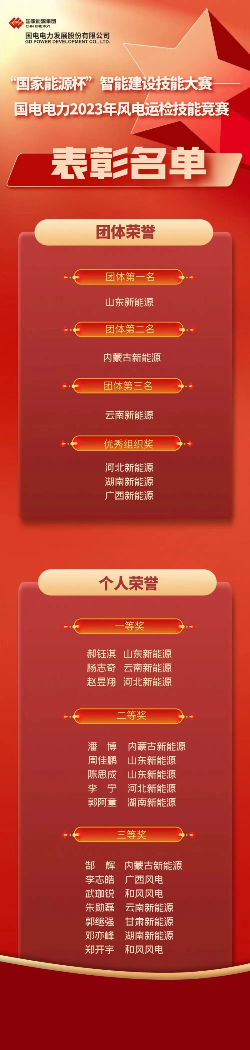 竞赛吸引了来自20家新能源企业的46名选手参加,经过2天“理论+实操”的激烈角逐,3名选手获得个人一等奖,5名选手获得个人二等奖,7名选手获得个人三等奖,获奖15名选手全部获得“国电电力青年岗位能手”荣誉称号。山东新能源、内蒙古新能源、云南新能源分别获得团体前三名,河北新能源、湖南新能源、广西风电获得优秀组织奖。
