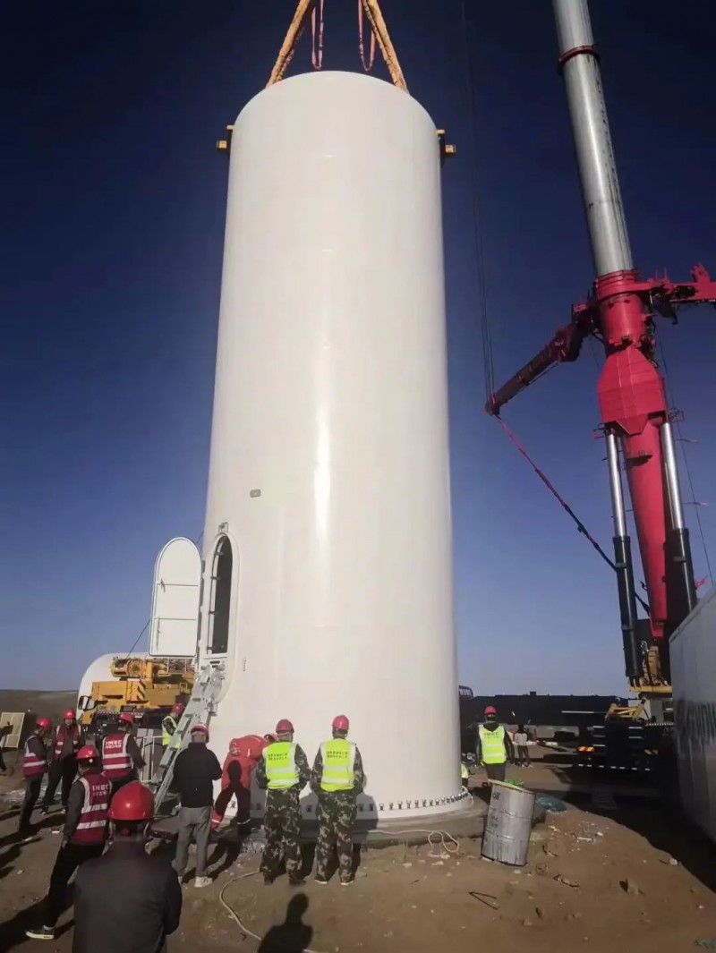 当天,F20风机五节塔筒全部吊装就位。