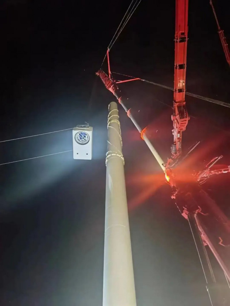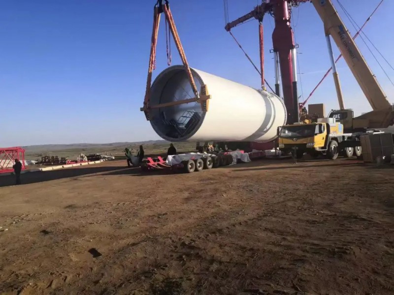6月10日6时18分,重达75吨的风机第一节塔筒起吊。