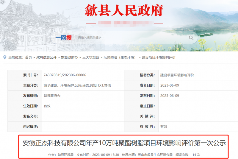 继蚌埠项目年产12 万吨聚酯树脂项目(一期)投产后,正杰集团马不停蹄继续扩产升级。近日,黄山市歙县生态环境分局对外发布《安徽正杰科技有限公司年产10万吨聚酯树脂项目环境影响评价第一次公示》。