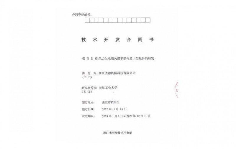 当前,我国风电行业已全面进入平价上网时代,据国家能源局统计数据显示,截止2023年一季度末,全国风电累计装机达到3.76亿千瓦,同比增长11.8%,市场对降本增效的需求更加强烈,持续加快技术迭代已经成为风电制造企业提升的一个重要方向。2022年,杰德机械聚焦风电市场的需求迭代,全面提升企业创新研发水平,主动联合浙江工业大学科研团队,就风力发电用关键零部件及大型锻件的研发这一项目展开全方位的技术合作。双方以企业面临的实际技术需求为导向,共同攻关技术瓶颈、积极探索科技前沿、实现协同创新发展,推动科技与产业深度融合、协调发展。