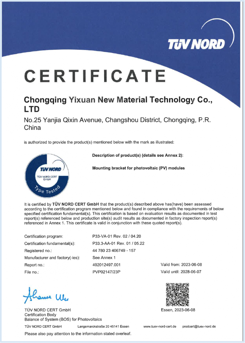 近日,TUV北德正式授予重庆亿煊新材料科技有限公司复合材料光伏支架国际认证证书。该认证是TUV北德针对复合材料支架应用于光伏领域性能要求的关键认证。TUV北德基于其技术规范T/CPIA 0013-2019,对重庆亿煊复合材料支架进行了材料力学性能、耐候性、易燃性等测试,整个测试周期表现良好。