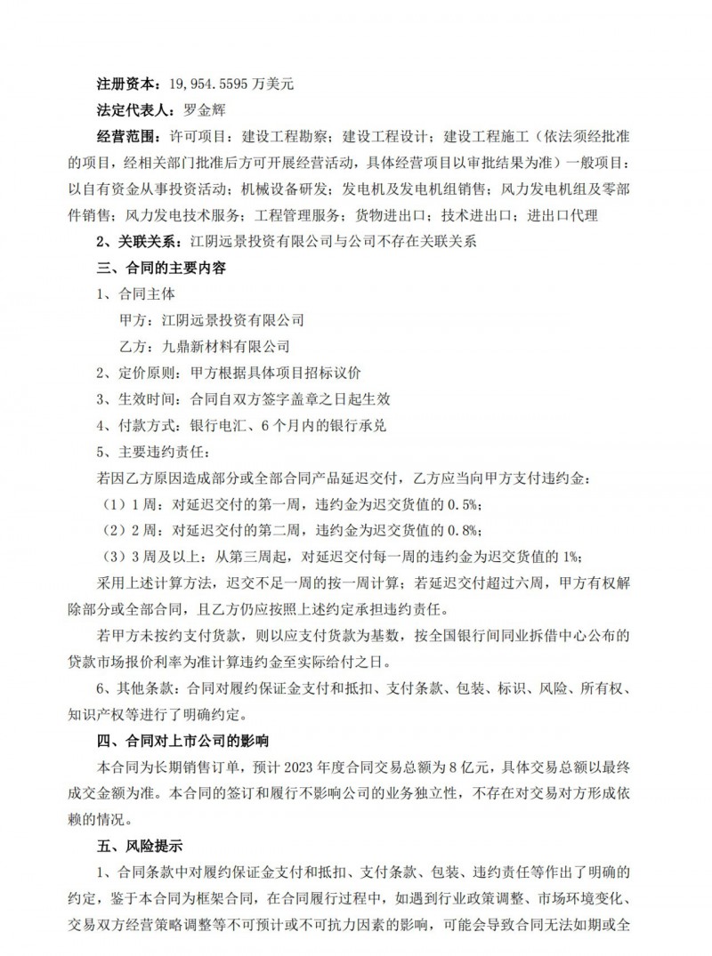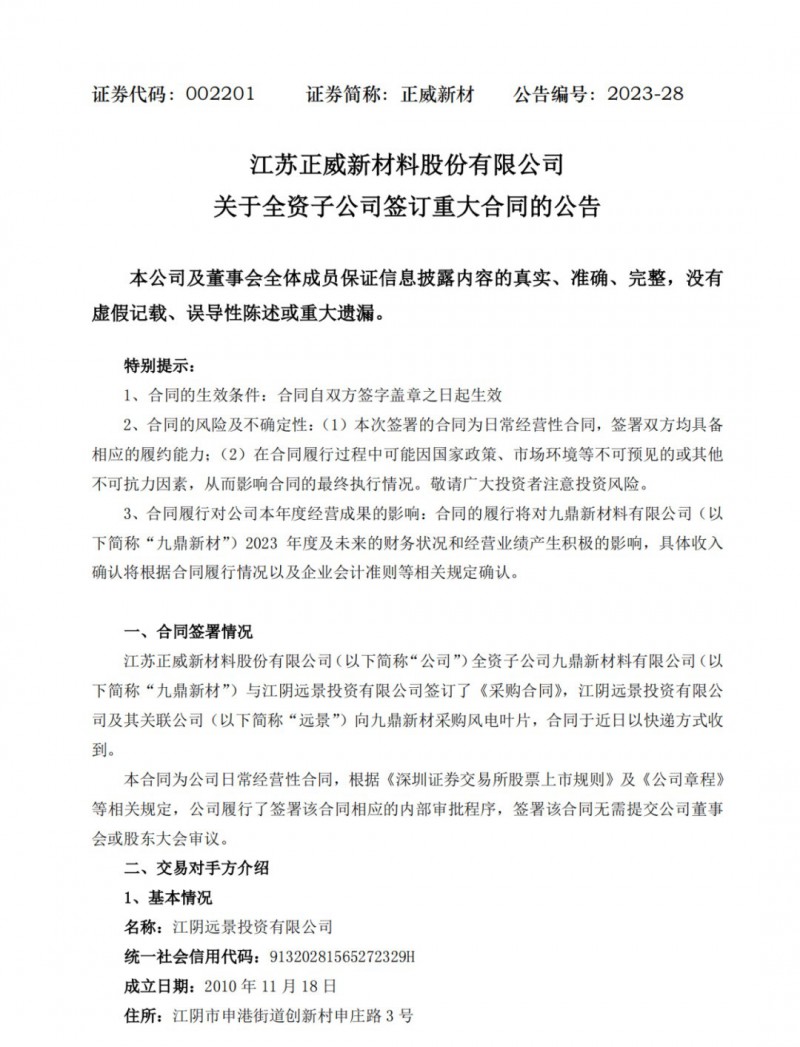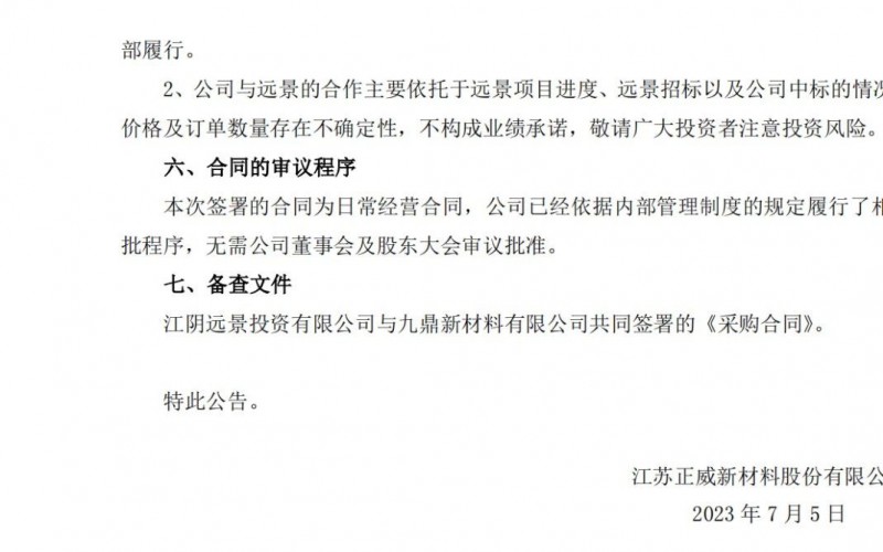7月5日,正威新材发布消息称,公司全资子公司九鼎新材料有限公司与江阴远景投资有限公司签订了《采购合同》,江阴远景投资有限公司及其关联公司向九鼎新材采购风电叶片,合同于近日以快递方式收到。