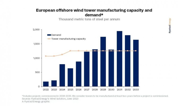 睿咨得能源 Rystad Energy最新数据显示,欧洲对海上风电塔的需求将在2028年前超过制造能力。