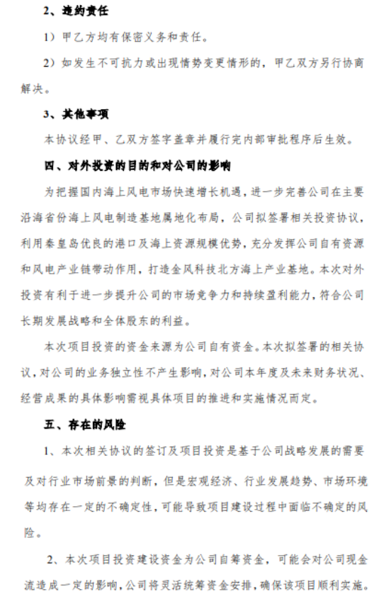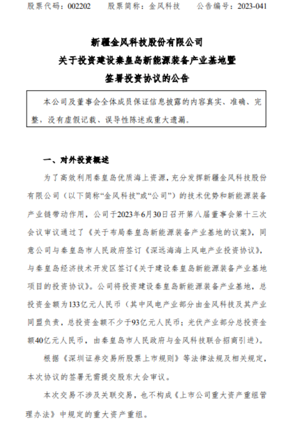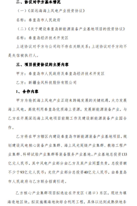 公告称,金风科技与秦皇岛市人民政府签订《深远海海上风电产业投资协议》,与秦皇岛经济技术开发区签订《关于建设秦皇岛新能源装备产业基地项目的投资协议》。上市公司将投资建设秦皇岛新能源装备产业基地,总投资金额为133亿元。其中风电产业部分由金风科技及其产业同盟负责,总投资金额不少于93亿元;光伏产业部分总投资金额40亿元,由秦皇岛市人民政府与金风科技联合招商引进。