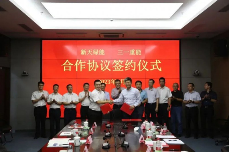 7月27日,新天绿色能源公司与三一重能股份有限公司在石家庄签署了战略合作协议。河北建投集团党委副书记、总经理、新天公司董事长曹欣,三一集团董事、执行总裁、三一重能董事长周福贵出席座谈并讲话。河北建投集团投资发展部、新天公司主要负责同志,三一集团氢能公司、营销公司、研究院有关负责人参加座谈。