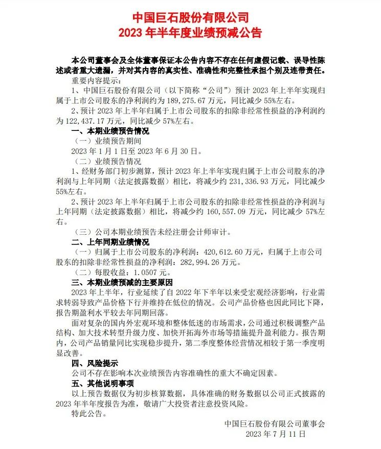 中国巨石发布业绩预告称,预计 2023 年上半年实现归属于上市公司股东的净利润约为 189,275.67 万元,同比减少 55%左右。预计 2023 年上半年归属于上市公司股东的扣除非经常性损益的净利润约为 122,437.17 万元,同比减少 57%左右。