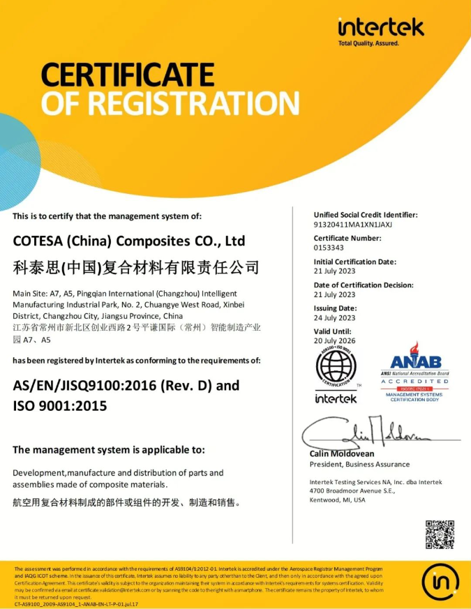 2023年7月27日,科泰思(中国)复合材料有限责任公司收到Intertek颁发的AS9100D质量管理体系认证证书,通过范围为“航空用复合材料制成的部件或组件的开发、制造和销售”。这是一项非常重要的里程碑,标志着科泰思(中国)在航空航天领域拥有独立的质量管控体系,为安泰复材成为中国商飞合格供应商和进一步开拓国内民用航空航天市场奠定了坚实的基础。