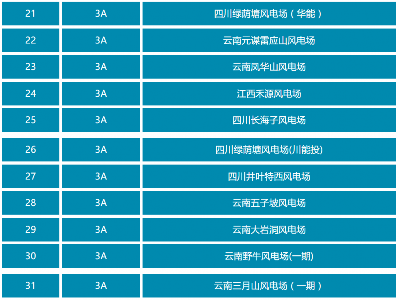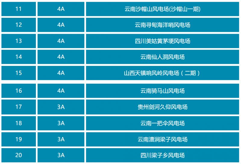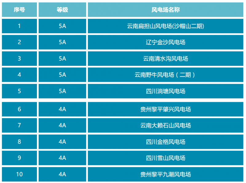 其中,辽宁阜新金沙风电场、云南扁担山风电场等5个风电场获5A级评价,四川美姑黄茅埂风电场等11个风电场获4A级评价,贵州久仰风电场等15个风电场获3A级评价。