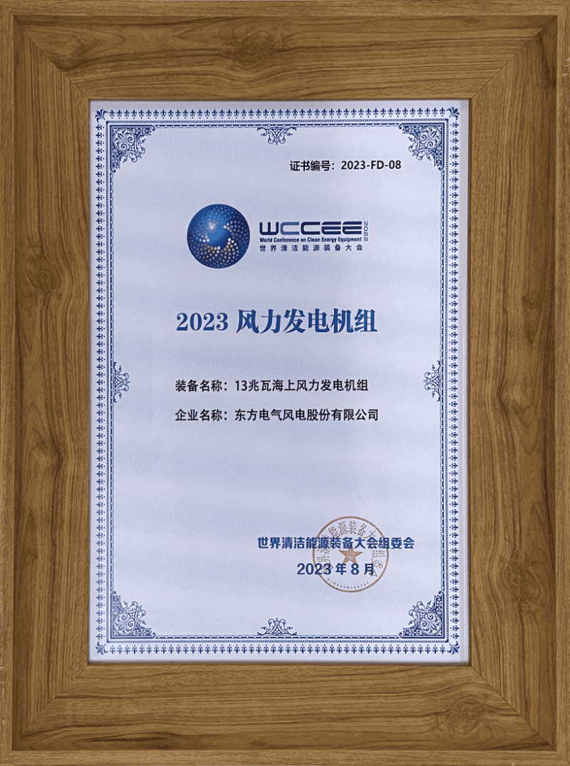 2023世界清洁能源装备大会由四川省人民政府、工业和信息化部共同主办,是世界级清洁能源装备行业盛会。“2023先进清洁能源装备”经过企业申报、专家审议、评选、名录公示等最终评选出20项成果,其中风力发电机组8项,东方风电13兆瓦海上风电机组上榜。