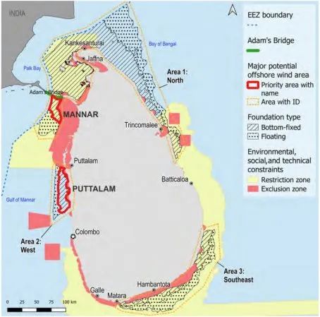 斯里兰卡确定的海上风电开发区域,包括为第一个项目确定的两个地点;