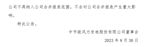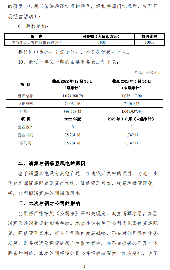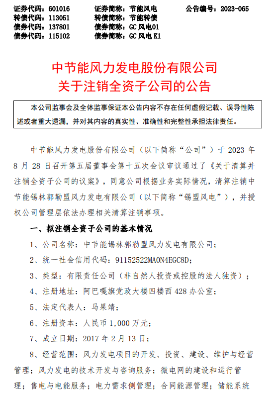 公告指出,节能风电于2023年8月28日召开第五届董事会第十五次会议审议通过了《关于清算并注销全资子公司的议案》,同意公司根据业务实际情况,清算注销中节能锡林郭勒盟风力发电有限公司,并授权公司管理层依法办理相关清算注销事项。