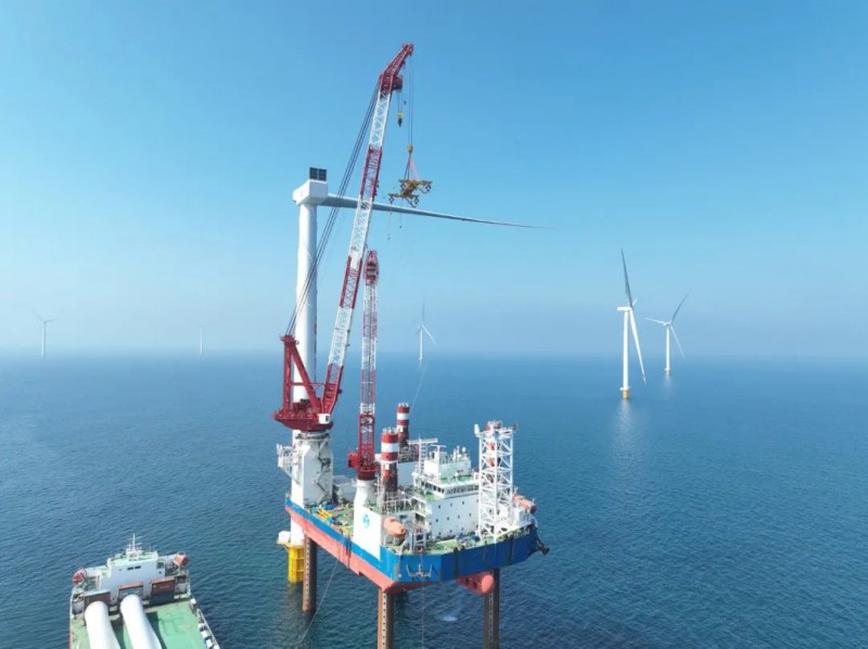 吊装初期,面对风机设备订货周期短等设备供货压力,通过增加叶片模具,跟踪风机大部件、提前建立安全库存等方式确保供货;按照“一机一方案”原则,组织各参建单位制定和落实有针对性的施工方案;精准锁定船机进场时间,按照3个吊装作业面,顺利完成风机吊装。