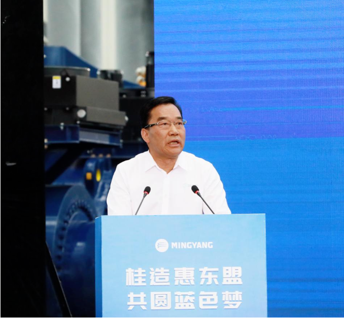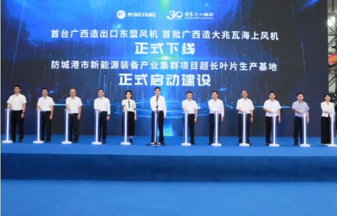 9月9日,明阳首批“广西造”大兆瓦海上风机下线仪式、防城港市新能源装备产业集群超长叶片生产基地启动仪式在广西省防城港市举行。广西壮族自治区政协副主席钱学明、防城港市委书记谭丕创、防城港市长黄江、明阳集团党委书记、董事长张传卫出席活动。