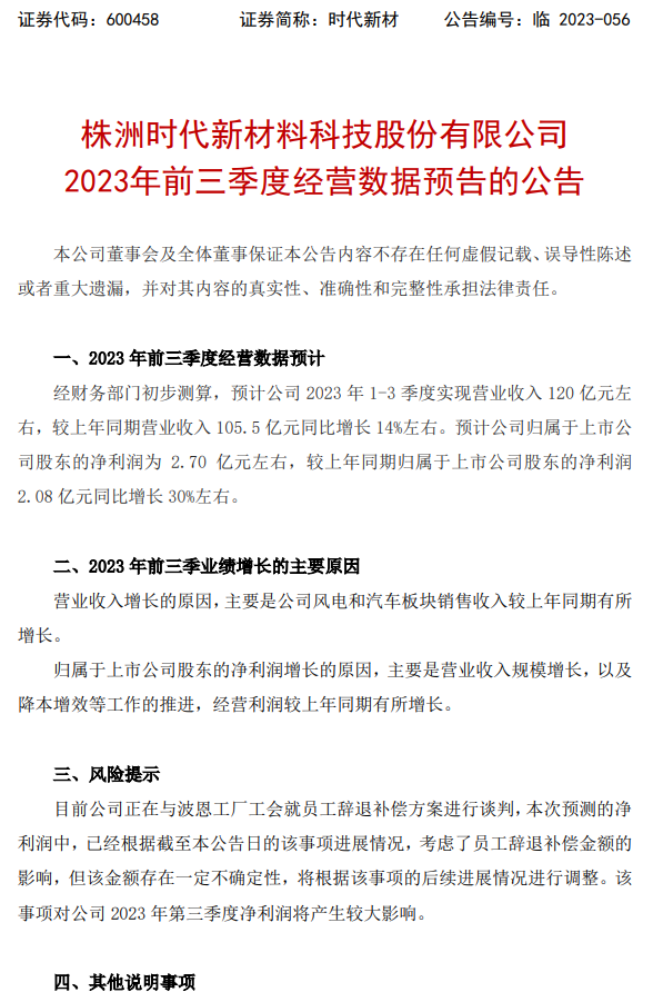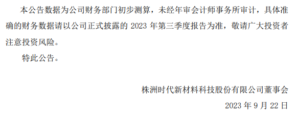 9月22日,株洲时代新材料科技股份有限公司(简称:时代新材)发布《2023年前三季度经营数据预告的公告》。